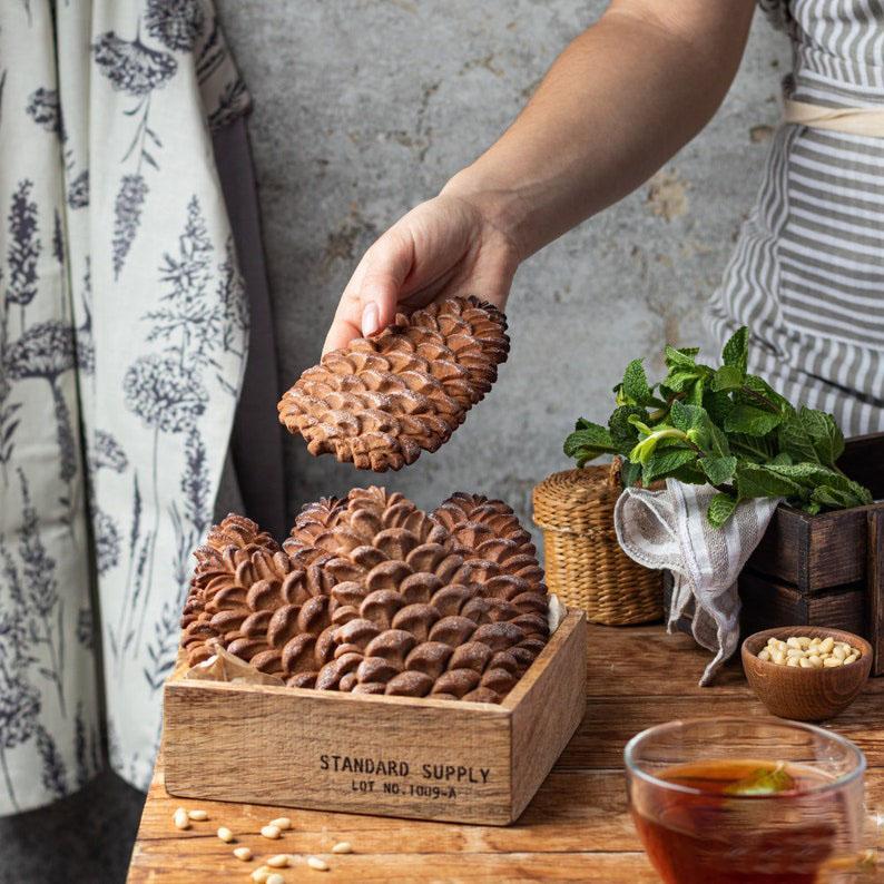 Deze houten bakvorm is gegraveerd met Provas-rozenmotieven en dennenappels, waardoor hij perfect is voor het maken van peperkoek- en honingcakes of koekjes. Geschikt voor muffins, cakes, koekjes, koekjes, pompoentaart, gebak, fudge en desserts.