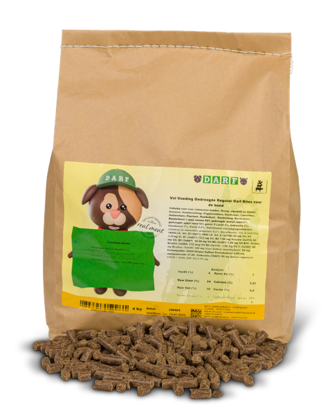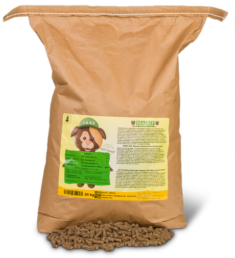 Darf-Vol is koud geperst droogvoer, afkomstig van onze slagerij. De verantwoorde én makkelijke vervanger van vers vlees, dat zijn onze natuurlijke hondenbrokken. Volkomen glutenvrij. Maar liefst 60% vlees aandeel!