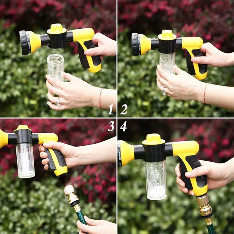 - TOEPASSING : Dit waterslangmondstuk past op een standaard 4-punts slang, u kunt hem eenvoudig aansluiten op uw tuinslang. De schuimsproeier is gemaakt van hoogwaardig rubber, dit slangmondstuk is gemakkelijk vast te pakken, antislip en zit comfortabel.