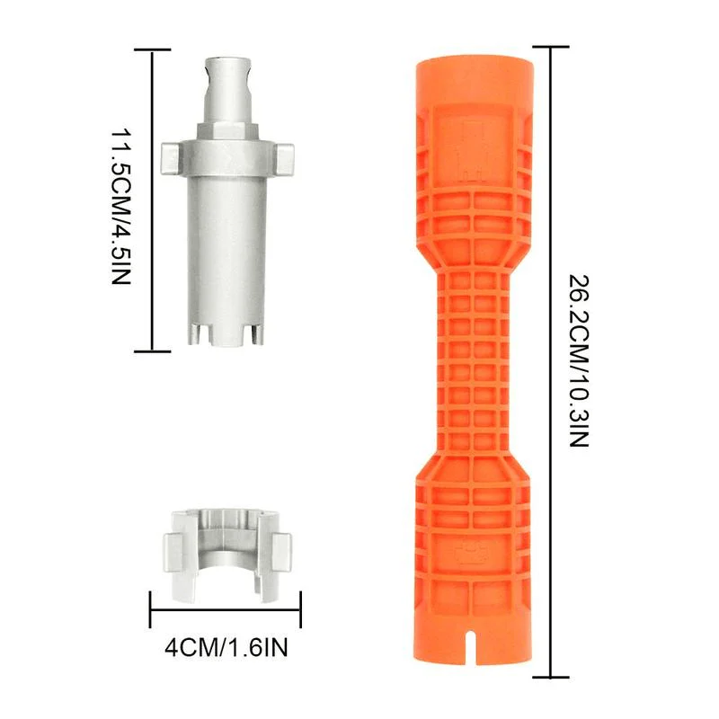 Kraan- en gootsteeninstallatiemodel heeft een open sleuf voor eenvoudige montage over bestaande toevoerleidingen (leidingen niet inbegrepen) . Het is een multifunctioneel sanitair gereedschap onder de gootsteen. Dit instrument wordt gebruikt voor vastmaken en verwijderen plastic bak noten, toevoerleiding noten, samen met 7/8″ en 1″ hex noten De tool ook voorzien van een aluminium inzetdeel voor draaien hoekaanslag handgrepen en een aluminium inzetstuk voor het vasthouden zeefvergaarbak plaats. De extra lange constructie maakt hem ideaal voor moeilijk bereikbare toepassingen.
