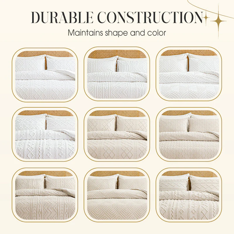 Geniet van de betoverende charme van artistieke cutwork patronen gecombineerd met zachte tufting — ervaar een slaapkamer sfeer die echt uniek, stijlvol en uitnodigend is.