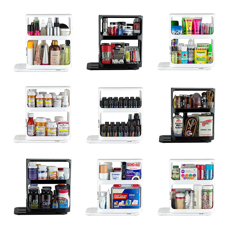 Til gewoon de hendel op, trek eraan en draai hem om gemakkelijk toegang te krijgen tot je georganiseerde spullen. Perfect als keukenkruidenrek-organizer.