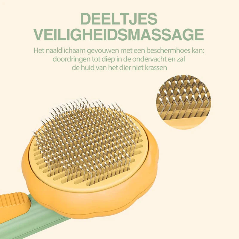 - Eenvoudig schoon te maken: wanneer u klaar bent met het borstelen van uw huisdier, klikt u gewoon op de knop en de borstelharen trekken zich terug in de borstel, waardoor het heel eenvoudig is om al het haar van de borstel te verwijderen, zodat deze klaar is voor het volgende gebruik.