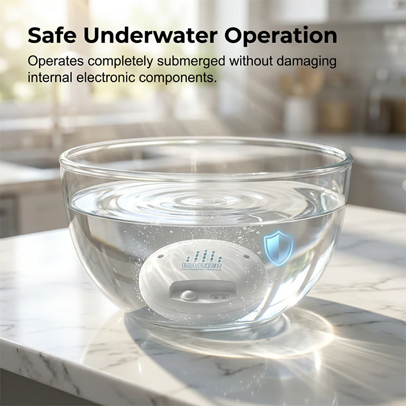 Dompel het simpelweg volledig onder met je fruit of voorwerpen in water, druk op een knop en zie hoe krachtige ultrasone golven vuil en resten oplossen — geen ingewikkelde installatie nodig.