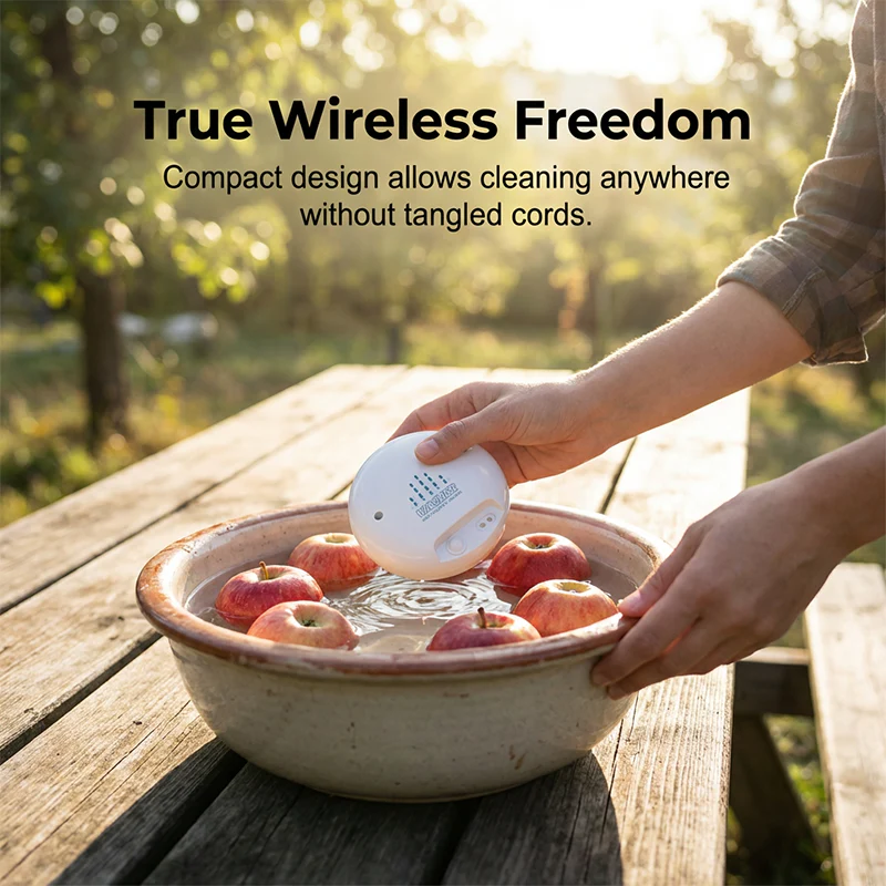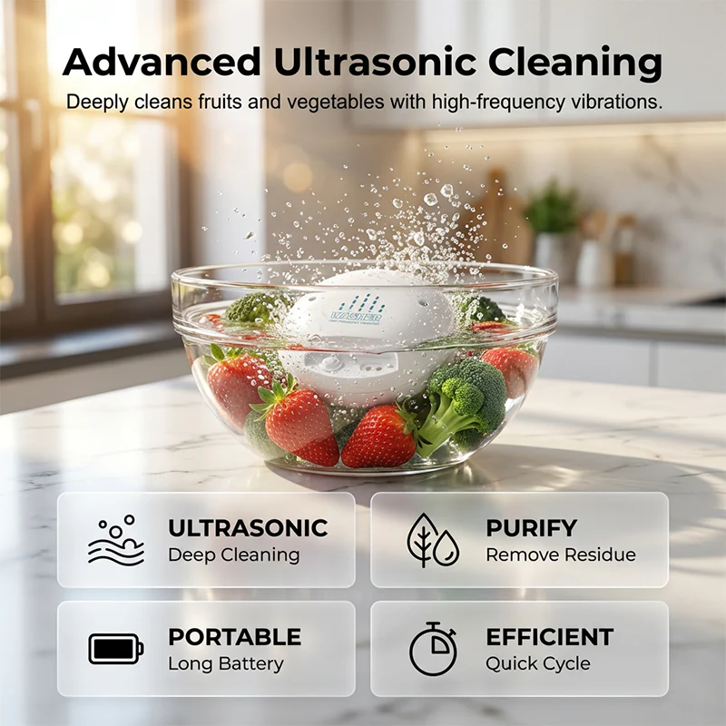Zeg vaarwel tegen verborgen vuil en chemicaliën op je fruit en groenten — ervaar de opluchting van diepgaande, op ultrasoon gebaseerde reiniging die snel, snoerloos en handig is.