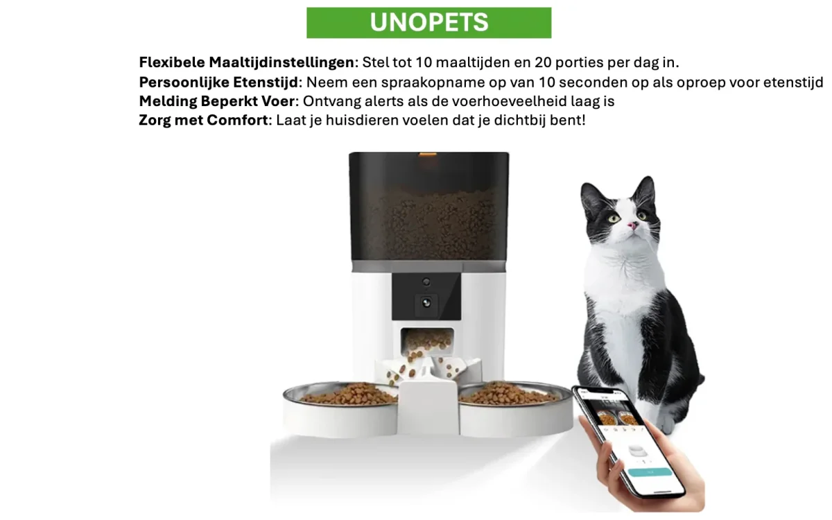 De Unopets Dubbele 4L Automatische Voerbak is ideaal voor huishoudens met meerdere huisdieren. Met twee aparte compartimenten krijgt elk huisdier de juiste portie voer, en via de app stel je eenvoudig voedertijden en porties in, waar je ook bent.