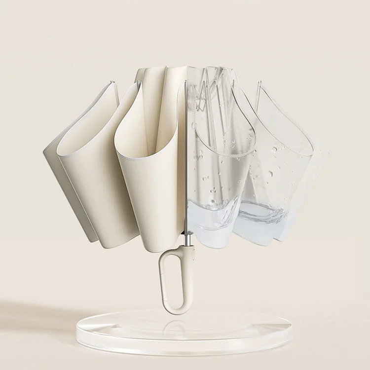 In gesloten toestand zit het regenoppervlak aan de binnenkant, zodat je niet nat wordt, zelfs niet als je de paraplu aanraakt (het droge oppervlak blijft aan de buitenkant).