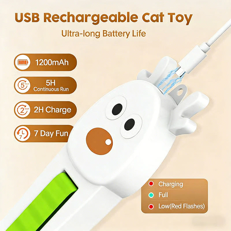 Slechts 2 uur opladen biedt tot wel 5 uur onophoudelijk speelplezier, waardoor uw kat energiek blijft en verveling wordt voorkomen.