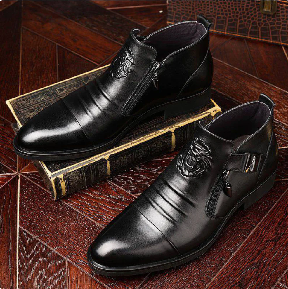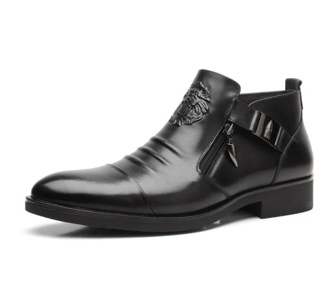 Verhoog je stijl met deze leren enkellaarsjes met een dubbelzijdige kap en puntige details voor heren. Deze laarzen combineren verfijning met cutting-edge details, waardoor ze een veelzijdige keuze zijn voor elke modebewuste man. De dubbelzijdige ritssluiting voegt een moderne touch toe, terwijl het spitse teenontwerp zorgt voor een gestroomlijnde, gepolijste look. Deze laarzen zijn gemaakt van leer van hoge kwaliteit, gaan lang mee en bieden superieur comfort. Of je nu gekleed gaat voor een formele gebeurtenis of op zoek bent om je casual kleding te verbeteren, deze laarzen zijn de perfecte aanvulling op je schoenencollectie.